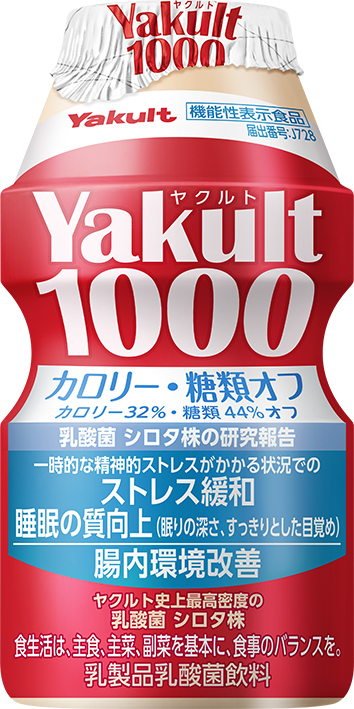 「Yakult(ヤクルト)1000」に比べ、糖質とカロリーを低減(32%オフ)し、甘さひかえめです。このたび、機能性表示食品の届出が受理されたことに伴い、パッケージに機能性表示食品に関する表示を行うとともに、「Yakult(ヤクルト)1000」に比べてカロリー32%オフ、糖類44%オフであることをわかりやすく訴求しています。