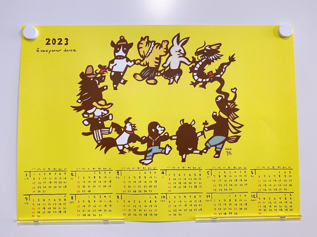 2023年のカレンダーは干支の動物たちが手を繋いで輪を作っているデザイン。